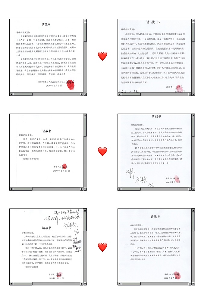 “我志愿加入中國(guó)共產(chǎn)黨…為防疫工作貢獻(xiàn)力量…愿堅(jiān)守在防疫戰(zhàn)斗的第一線”“隨時(shí)聽(tīng)候調(diào)令,奔赴防疫一線,義無(wú)反顧,不計(jì)報(bào)酬,不論生死”“雖然我們是精神心理??漆t(yī)院,但我已準(zhǔn)備好隨時(shí)投身抗擊疫情的前沿戰(zhàn)線”。