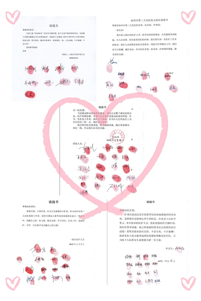 請(qǐng)戰(zhàn)是對(duì)信念與信念的付諸行動(dòng),申請(qǐng)是對(duì)情懷與宗旨的執(zhí)著追求。一個(gè)個(gè)義無(wú)反顧的紅手印飽含決心,一個(gè)個(gè)紅手印、飽含了醫(yī)務(wù)工作者“敬佑生命、救死扶傷、甘于奉獻(xiàn)、大愛(ài)無(wú)疆”的責(zé)任擔(dān)當(dāng)與戰(zhàn)勝疫情的必勝信心。