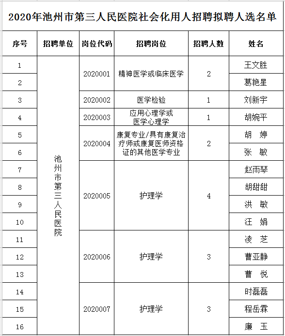 根據(jù)《池州市第三人民醫(yī)院2020年社會(huì)化用人招聘工作人員公告》、《池州市第三人民醫(yī)院2020年社會(huì)化用人招聘緊缺專業(yè)人才公告》規(guī)定,經(jīng)報(bào)名、資格復(fù)審、筆試、面試、體檢、考察等程序,王文勝等16名考生符合相應(yīng)招聘崗位條件,確定為擬聘人員?,F(xiàn)將擬聘人員名單予以公示,公示時(shí)間為2021年2月22日至2月28日。