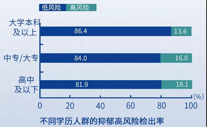 不同學(xué)歷的調(diào)查對(duì)象在心理健康水平上也存在差異。以抑郁為例,大學(xué)本科及以上群體的抑郁高風(fēng)險(xiǎn)檢出率為13.6%,中專(zhuān)/大專(zhuān)群體的檢出率為16%,高中及以下群體的檢出率為18.1%。