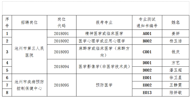 根據(jù)《2018年池州市衛(wèi)生計(jì)生系統(tǒng)事業(yè)單位赴高?,F(xiàn)場招聘專業(yè)技術(shù)人員公告》規(guī)定,按專業(yè)測試成績高低順序和公開招聘崗位計(jì)劃數(shù)1:1比例,確定姜妍等8名人員為體檢對象。現(xiàn)將體檢有關(guān)事項(xiàng)公告如下: