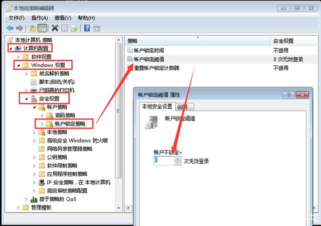 b. 計(jì)算機(jī)設(shè)置---Windows設(shè)置---安全設(shè)置---賬戶策略---賬戶鎖定策略”,然后到右側(cè)窗格中的“賬戶鎖定閾值”項(xiàng),這里可以設(shè)置用戶賬戶被鎖定的登錄嘗試失敗的次數(shù),該值在0到999之間,默認(rèn)為0表示登錄次數(shù)不受限制,我們可以改為3或10。(設(shè)置完成后,還可以設(shè)置賬戶鎖定的時(shí)間)