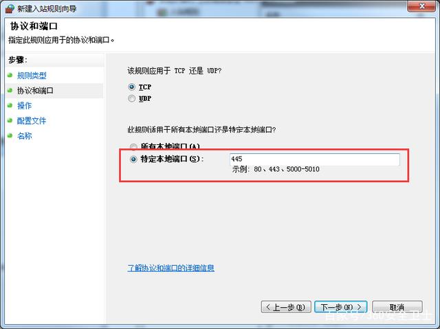 d.在“特定本地端口”中輸入“445”,點(diǎn)擊進(jìn)入下一步, 然后在操作中選擇“阻止連接”,點(diǎn)擊進(jìn)入下一步