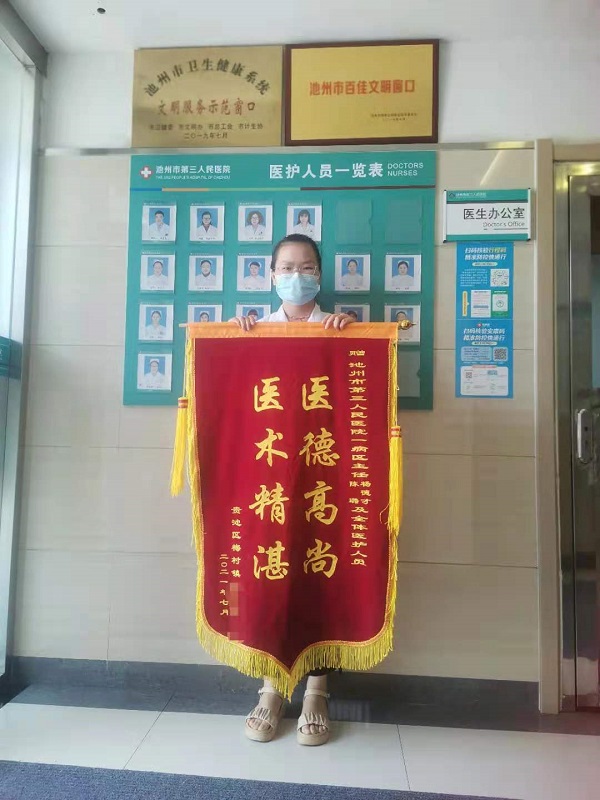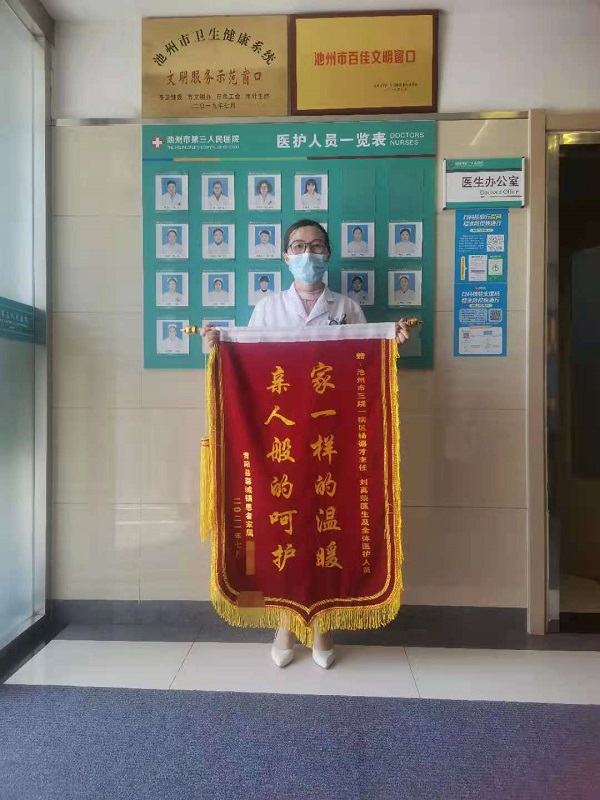 近日,市三院一病區(qū)全體醫(yī)護(hù)人員分別收到貴池區(qū)梅村鎮(zhèn)、青陽縣蓉城鎮(zhèn)患者家屬贈(zèng)送的寫著“家一樣的溫暖 親人般的呵護(hù)”和“醫(yī)德高尚 醫(yī)術(shù)精湛”的兩面錦旗,對(duì)患者住院治療期間悉心的照料表示感謝。