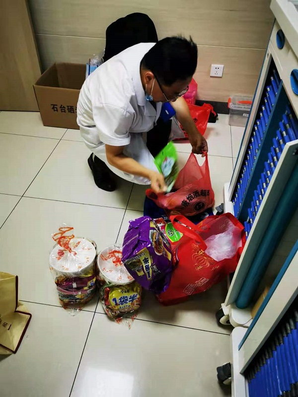 7月26日上午,市三院心腦電圖室主任黃銘給二病區(qū)患者送去牛奶、方便面等食物,并詳細(xì)詢問(wèn)病人的身體狀況,鼓勵(lì)他們好好治療。