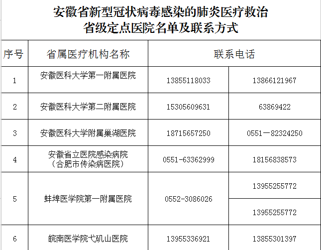 安徽省新型冠狀病毒感染的肺炎醫(yī)療救治各級定點醫(yī)院名單及聯(lián)系方式
