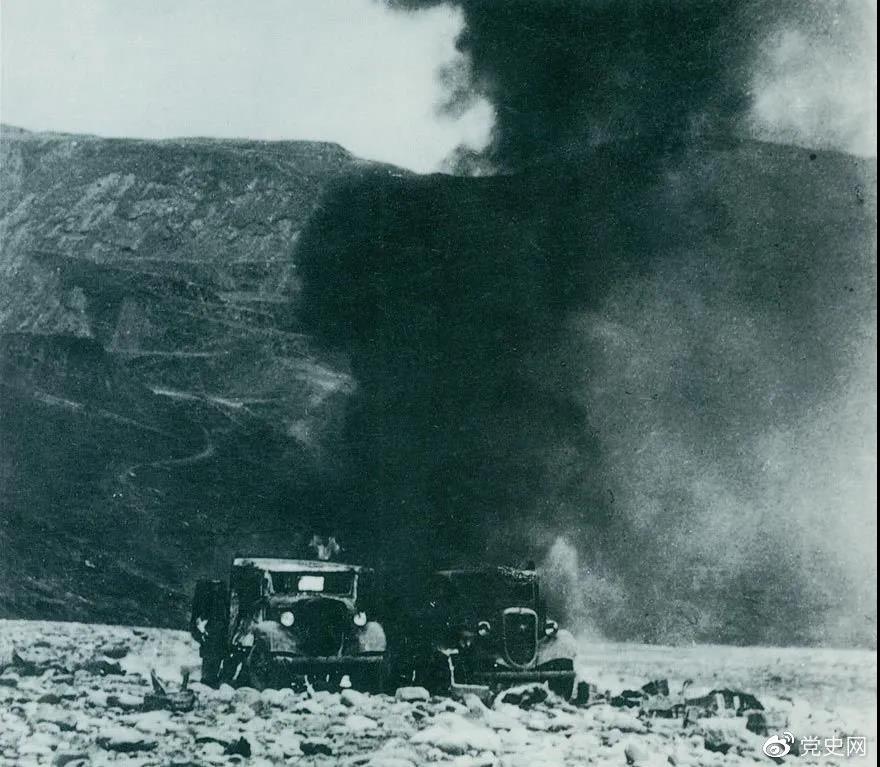 1937年10月18日,八路軍第一二〇師一部在山西雁門(mén)關(guān)以南伏擊日軍,斃傷敵300余人,擊毀敵汽車(chē)20余輛。圖為燃燒著的日軍汽車(chē)。
