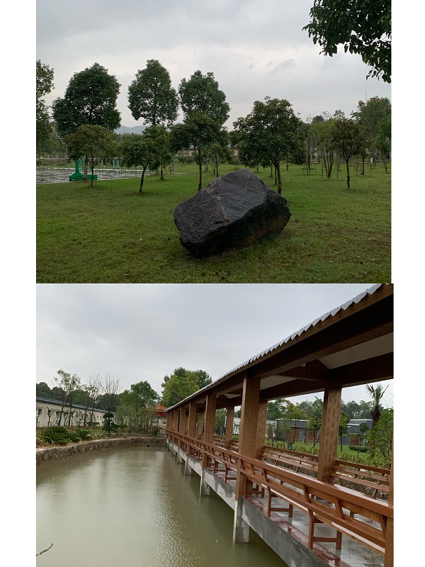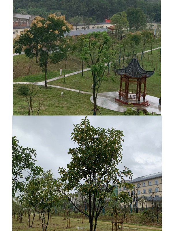 今天我值班,天下著小雨,準(zhǔn)備看看前段時間因長時間晴好天氣而干涸的“尚賓榭”和旁邊的荷花塘,但走到配電房時,一陣桂花香撲面而來。雨中小游的想法油然而生,沿著尚未完工的小路,走到“尚賓榭”時,發(fā)現(xiàn)水榭中水近一米深,連接荷花塘的水管已看不到水的流動。當(dāng)走到“尚賓榭”中央時,遠(yuǎn)處又飄來一陣桂花香,巡著花香方向,走到今年新栽的花的方陣,原來是市住建局贈送移植的桂花開放了,那香味像一根琴弦撥動了我的心琴,讓我流連忘返。