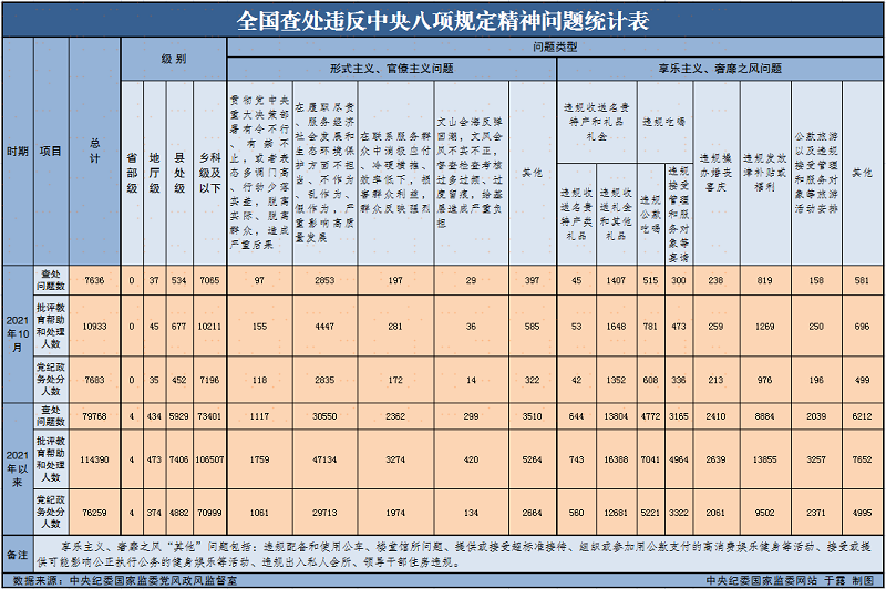 11月24日,中央紀(jì)委國(guó)家監(jiān)委公布了2021年10月全國(guó)查處違反中央八項(xiàng)規(guī)定精神問題匯總情況。今年10月,全國(guó)各級(jí)紀(jì)檢監(jiān)察機(jī)關(guān)共查處違反中央八項(xiàng)規(guī)定精神問題7636起,批評(píng)教育幫助和處理10933人,其中黨紀(jì)政務(wù)處分7683人。這是中央紀(jì)委國(guó)家監(jiān)委連續(xù)第98個(gè)月公布月報(bào)數(shù)據(jù)。