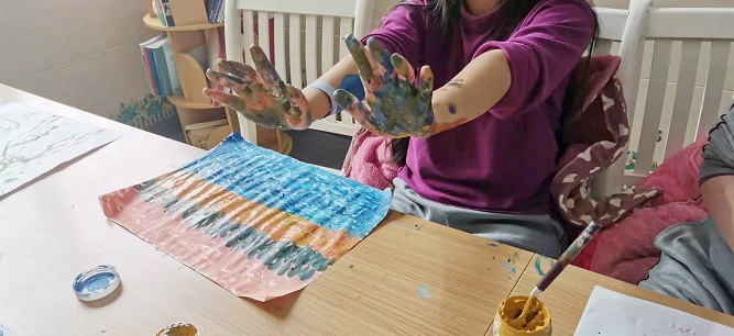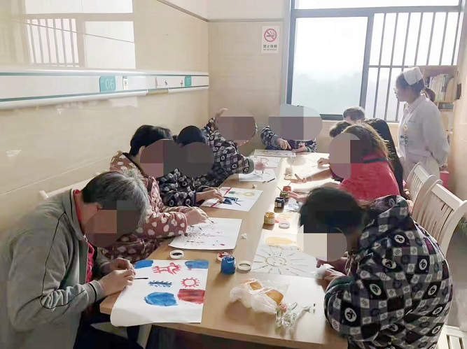 “大家好,我叫….我來(lái)自烏沙,我的愛(ài)好是畫畫、唱歌…”隨著一句句簡(jiǎn)短的自我介紹結(jié)束,五病區(qū)十五位年齡大小不等的患者在冬日暖陽(yáng)下開(kāi)始了今天的繪畫治療。治療開(kāi)始前,在治療師的帶領(lǐng)下,我們玩起熱身小游戲-你畫我猜,調(diào)動(dòng)了活動(dòng)氛圍。游戲結(jié)束,馬上進(jìn)入了今天的主題活動(dòng)-涂鴉。在柔和的音樂(lè)聲中,患者們帶著新奇和激動(dòng)的心情開(kāi)始在手上涂顏料,然后以手為筆,在畫紙上肆意作畫,一個(gè)小時(shí)之后,大家心滿意足的結(jié)束了作畫,最后治療師對(duì)此次治療活動(dòng)進(jìn)行了總結(jié):“今天大家的表現(xiàn)都很好,從剛開(kāi)始的害怕畫不好,到成功完成一幅作品,從剛開(kāi)始的不自信,到最后對(duì)自己作品的欣賞,讓我們?yōu)榱俗约旱谋憩F(xiàn),鼓掌!當(dāng)然還有從剛開(kāi)始大家之間陌生,不說(shuō)話,到整個(gè)治療過(guò)程中大家之間的互動(dòng),溝通交流,表現(xiàn)非常好,讓我們?cè)僖淮螢樽约汗恼疲〗裉斓闹委熁顒?dòng)到此結(jié)束,感謝大家的積極參與!”