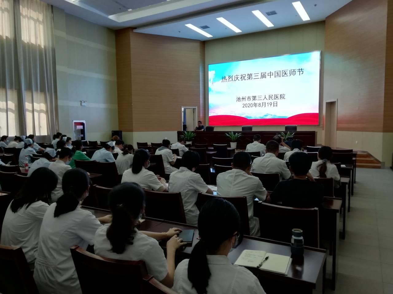 8月19日下午,在第三屆中國醫(yī)師節(jié)來臨之際,為激勵廣大醫(yī)務(wù)工作者弘揚“敬佑生命、救死扶傷、甘于奉獻、大愛無疆”的職業(yè)精神,市三院舉行第三屆中國醫(yī)師節(jié)慶祝大會。院領(lǐng)導及各病區(qū)、醫(yī)技、職能科室醫(yī)務(wù)人員代表共70余人參加。