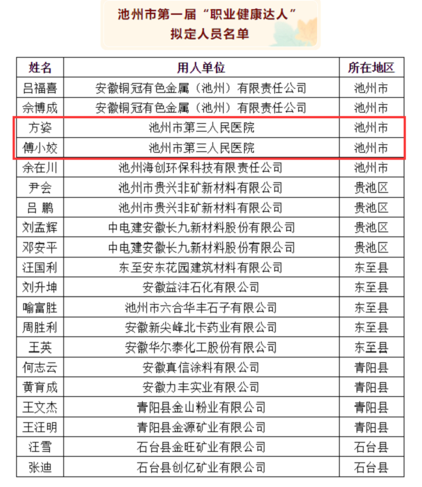 近日,池州市衛(wèi)生健康委公布池州市第一屆“職業(yè)健康達人”名單,市三院方姿、傅小姣在內。