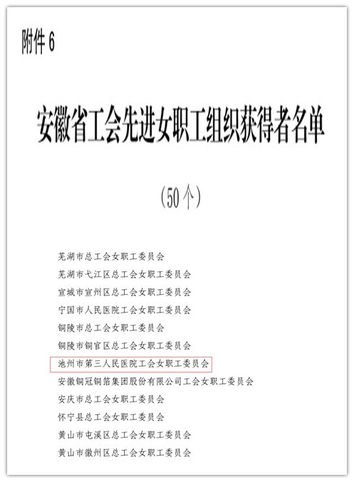 近日,池州市第三人民醫(yī)院工會女職工委員會榮獲“安徽省工會先進(jìn)女職工組織”的榮譽(yù)稱號。