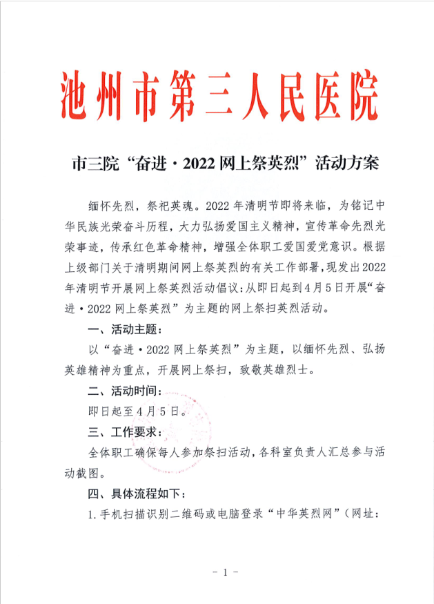 清明節(jié)到來之際,為緬懷革命烈士先輩,傳承紅色革命精神,同時避免人員聚集,市三院響應文明祭掃倡議,組織全體干部職工通過網(wǎng)絡(luò)平臺開展為期6天的“奮進·2022網(wǎng)上祭英烈”活動。