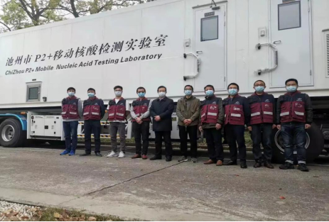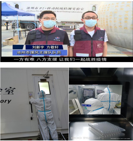 我們的工作地點(diǎn)在馬鞍山市會(huì)展中心廣場(chǎng),放眼望去,這里已停了十來(lái)輛來(lái)自省內(nèi)其他市縣的支援檢測(cè)車輛和旁邊搭起的臨時(shí)帳篷,一切顯得緊張有序。這次池州共派出8名檢驗(yàn)人員,分別來(lái)自市疾控中心、市立醫(yī)院、市二院、市中醫(yī)院等醫(yī)療機(jī)構(gòu)。我們這支隊(duì)伍還有幾位同志是從支援安慶結(jié)束后短暫休整了一夜又匆匆趕過(guò)來(lái)的,感覺疫情期間所有的醫(yī)務(wù)人員都不容易??!當(dāng)天下午我們就上了檢測(cè)車熟悉儀器和操作流程,邊學(xué)邊干、邊干邊學(xué),待到晚飯時(shí)間一出檢測(cè)艙,脫下防護(hù)服,摘下N95口罩后,感覺呼吸好輕松,好舒服。也實(shí)實(shí)在在體會(huì)到了嚴(yán)格防護(hù)下身體的難受,悶熱、呼吸累、口罩勒得人臉頰疼等。