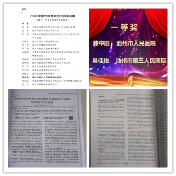 近年來,藥劑科狠抓業(yè)務(wù)學(xué)習(xí),科研創(chuàng)新,積極參加省市各類藥學(xué)技能大賽,并多次獲獎。吳佳俊副主任、主管藥師,作為池州市代表參加全省比賽,獲得“2020年度市級青年崗位能手”稱號,2021年獲得“醫(yī)院藥師個體化藥學(xué)服務(wù)大賽池州分區(qū)賽”一等獎。