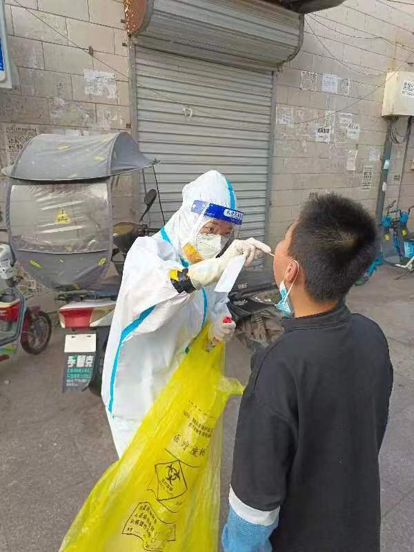 四月的天氣越發(fā)炎熱,我們的工作也變得更加具有挑戰(zhàn)性。每天,我都要穿著密不透風(fēng)的防護(hù)服穿梭在大街小巷上,在烈日的照射下,我呼吸越來(lái)越急促,胸前的汗水也在往下流,操作時(shí),我左手固定著試管,右手持拭子棉簽,伴隨著采集人數(shù)越來(lái)越多,我的左手大拇指和食指慢慢有點(diǎn)僵硬,旁邊的志愿者見(jiàn)狀開(kāi)始幫我拆棉簽然后遞給我,讓我的心里暖暖的。一天工作結(jié)束,脫去防護(hù)服后那一刻,我瞬間感受到一陣清涼,不禁發(fā)出一聲感慨:“好涼快啊”,這時(shí)的我頭發(fā)已被汗水打濕,臉上也被勒出了痕跡,但看到自己完成了153管、431人次的采樣工作后,我在心里默默鼓勵(lì)了一下自己:“你今天真的很棒”。
