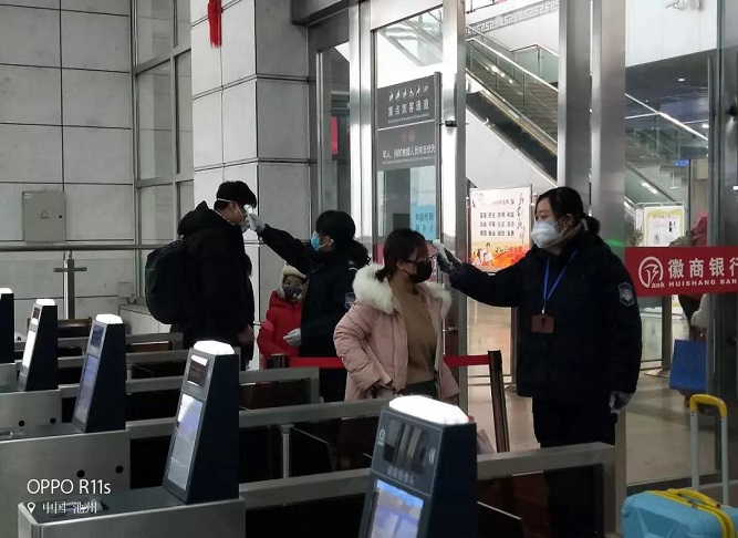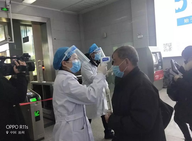1月27日大年初三。上午9點14分,G9501合肥至安慶的動車到達池州站,市人民醫(yī)院、池州三院的醫(yī)護人員在出站口手拿體溫檢查儀,等待下車乘客的到來。