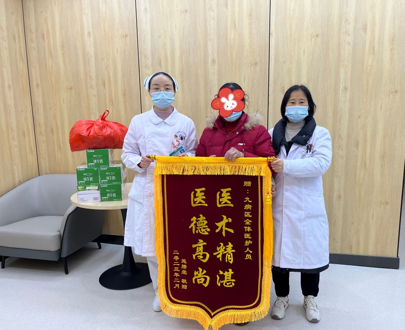 2月13日上午,已出院患者及其家屬將一面寫有醫(yī)術(shù)精湛,醫(yī)德高尚”的錦旗送給了九病區(qū)全體醫(yī)護(hù)人員,并為在院患者送來牛奶及面包,感謝對其住院期間的精心治療及護(hù)理。
