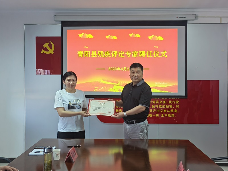 青陽(yáng)縣殘聯(lián)理事長(zhǎng)蘇文彥為市三院醫(yī)務(wù)人員代表授予了殘疾鑒定委員會(huì)專(zhuān)家?guī)斐蓡T聘書(shū)。