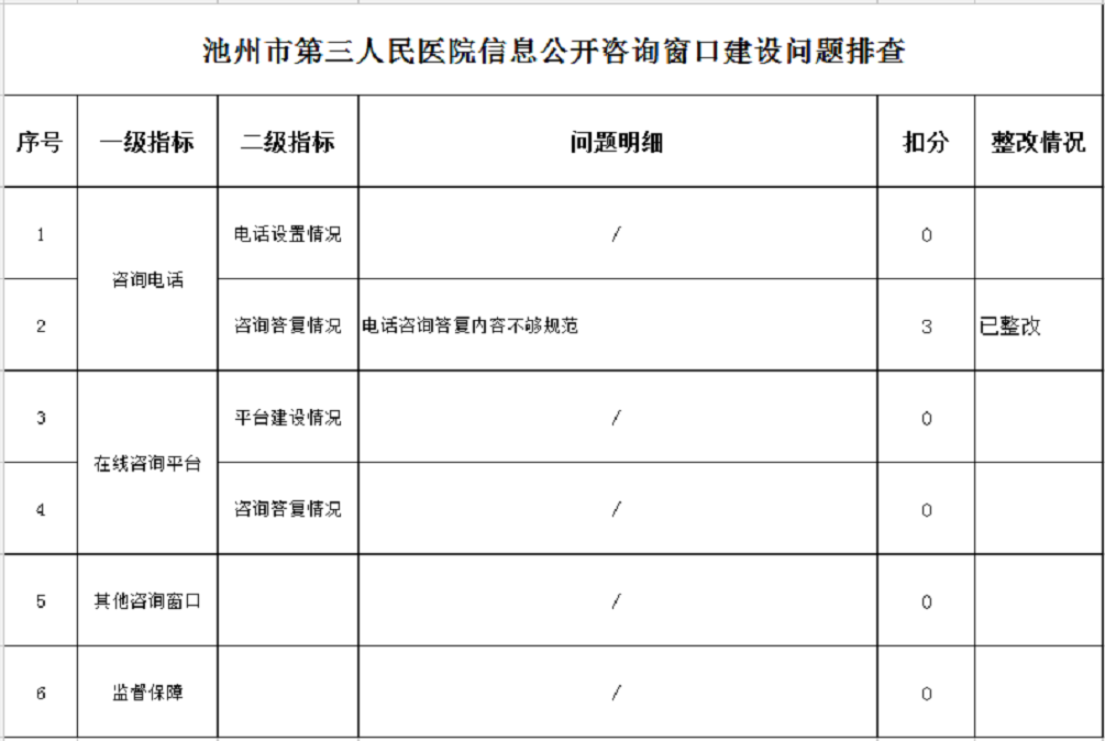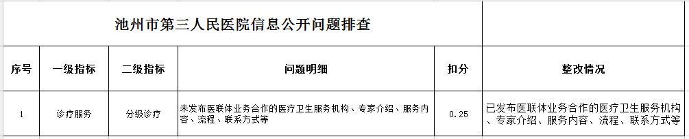 池州市第三人民醫(yī)院按《池州市第三人民醫(yī)院信息公開問題清單》《池州市第三人民醫(yī)院窗口建設(shè)問題清單》所列清單逐條進(jìn)行細(xì)致整改,現(xiàn)已全部整改到位。