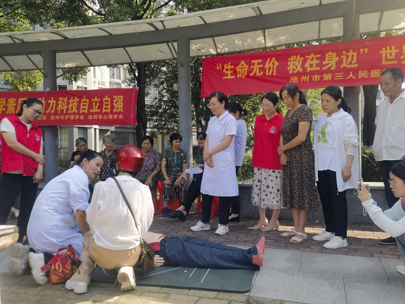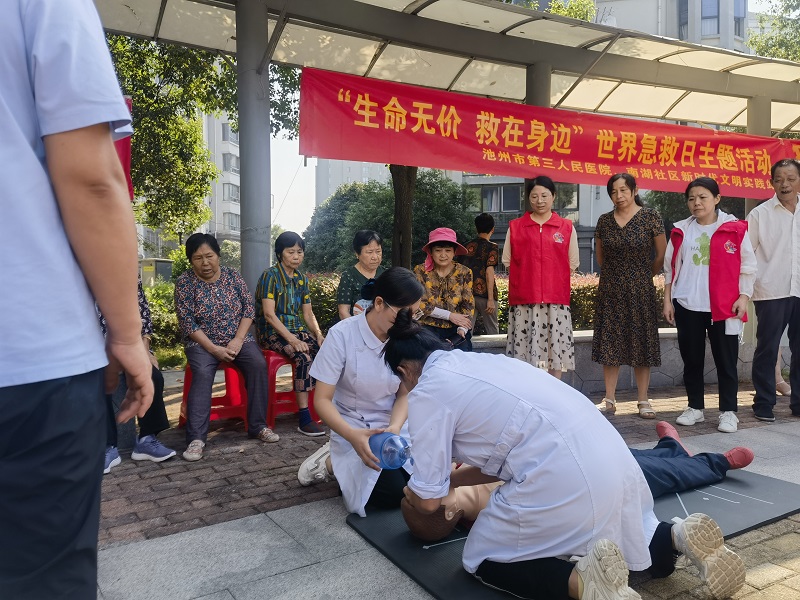 為深入學習貫徹習近平新時代中國特色社會主義思想,踐行“人民至上,生命至上”理念,9月8日,在第24個“世界急救日”即將到來之際。池州市第三人民醫(yī)院赴南湖社區(qū)舉辦“生命無價,救在身邊”主題宣傳活動。