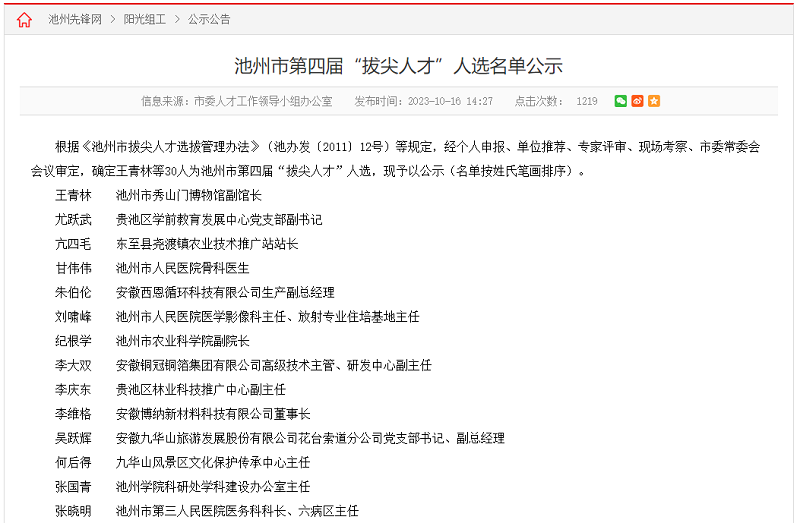 近日,中共池州市委人才工作領(lǐng)導(dǎo)小組下發(fā)《關(guān)于命名表彰池州市第四屆拔尖人才的決定》,全市30人入選,我院張曉明同志獲此殊榮。