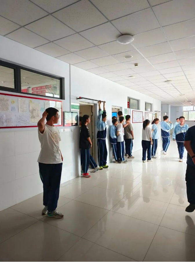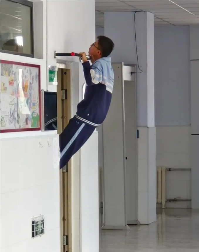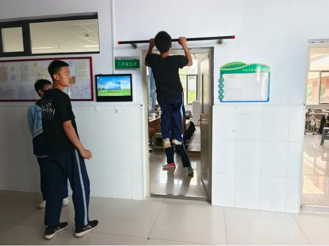 這是內(nèi)蒙古的準(zhǔn)格爾旗實(shí)驗(yàn)中學(xué)初一和初二年級(jí)的教室門口與眾不同的地方是這些教室在門框上方安裝了一根引體向上橫桿。