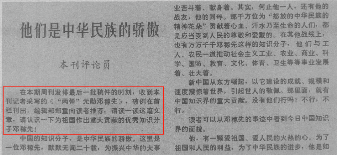 1986年6月23日出刊的《瞭望》周刊,破例在首欄刊出稿件《“兩彈”元?jiǎng)奏嚰谙取罚@是鄧稼先的事跡首次解密公開