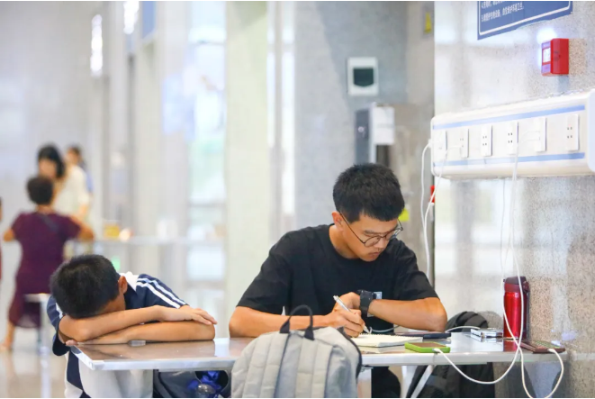在清流站候車(chē)室,學(xué)子們?cè)谧粤?xí)、休息。 張海根 攝
