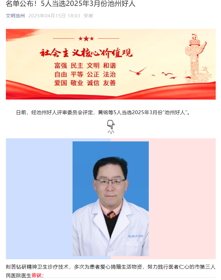 日前,經(jīng)池州好人評(píng)審委員會(huì)評(píng)定,市三院黃銘同志獲評(píng)2025年3月份“池州好人”。