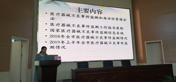 最后授課的是市藥品不良反應(yīng)監(jiān)測中心劉燕老師,她主要對(duì)《醫(yī)療器械不良事件監(jiān)測和再評(píng)價(jià)管理辦法》、《醫(yī)療器械不良事件監(jiān)測工作指導(dǎo)原則》進(jìn)行了解讀,并對(duì)2018年至2019年上半年全市醫(yī)療器械不良事件監(jiān)測情況進(jìn)行了通報(bào)分析。