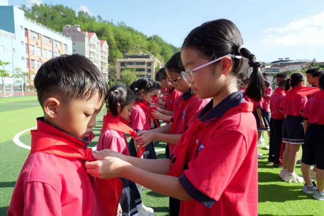 出席活動(dòng)的老師與老隊(duì)員們一起為新隊(duì)員佩戴上鮮艷的紅領(lǐng)巾。在國(guó)旗下、隊(duì)旗旁,新隊(duì)員們胸前的紅領(lǐng)巾隨風(fēng)飄揚(yáng),他們眼神堅(jiān)定,在校大隊(duì)輔導(dǎo)員的帶領(lǐng)下,進(jìn)行了鏗鏘有力的宣誓。活動(dòng)不僅增強(qiáng)了少先隊(duì)員的光榮感和歸屬感,也激勵(lì)了隊(duì)員們?yōu)閳?bào)效祖國(guó)貢獻(xiàn)智慧與力量,讓星星火炬在民族復(fù)興的征程中綻放更加燦爛的光芒。