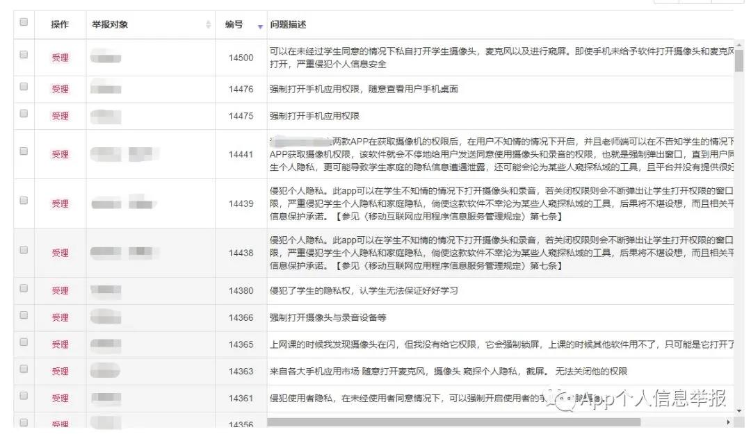 此外,很多網友也反饋,“一些網課App在安裝使用時就強制要求打開攝像頭等權限,否則無法正常打開使用,同時,賦予了教師端或管理端特權,比如可以在不通知學生情況下直接開啟學生前置攝像頭、麥克風等,視頻畫面直接暴露在其他師生面前,個人隱私和家庭隱私的“失控”讓他們覺得不安”。設置這種機制的初衷,可能是為了讓在線教育達到線下教育的效果,對學生的學習情況采取線上“突擊檢查”。然而,在實際操作過程中,需要盡可能考慮恰當的方案,不可顧此失彼,比如,即使App要求用戶開啟了攝像頭權限,但是從技術上限制非課堂時間攝像頭等權限的使用;在管理端遠程打開攝像頭時,給予用戶提示圖示或提示音等。