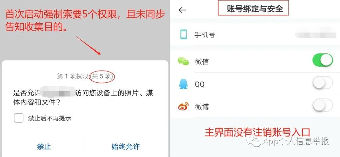 (2)75%的App首次啟動時,申請可收集個人信息的權限且并未同步告知收集目的,部分權限被設置為必須提供,不允許即閃退,無法瀏覽App或使用其基本功能。甚至還有App首次啟動時一次性申請授權所有可能用到的權限,否則無法使用App。