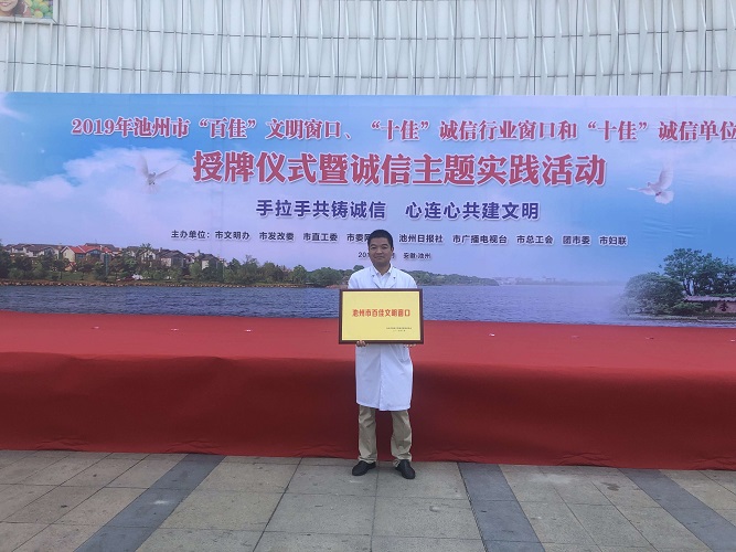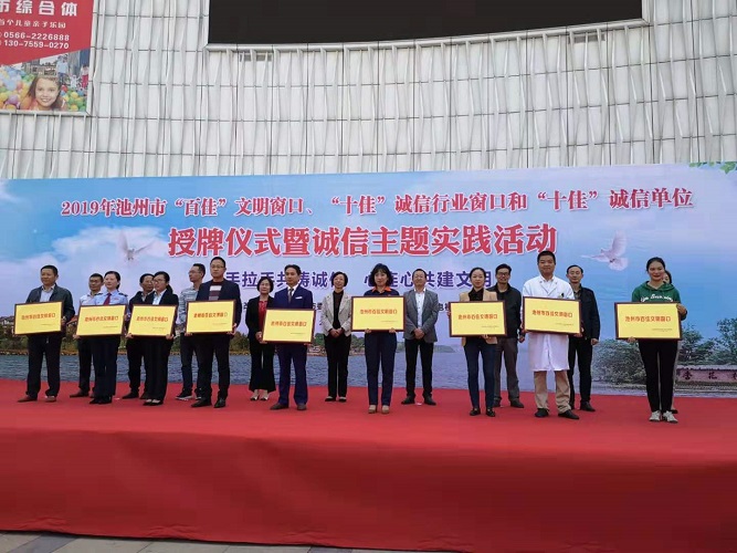 為表彰先進(jìn)、弘揚(yáng)正氣,10月18日,池州市“百佳”文明窗口、“十佳”誠信行業(yè)窗口和“十佳”誠信單位授牌儀式暨誠信主題實(shí)踐活動(dòng)在池州市遠(yuǎn)東國際廣場(chǎng)隆重舉行。在此次授牌儀式上,市三院一病區(qū)榮獲池州市“百佳”文明窗口稱號(hào)。